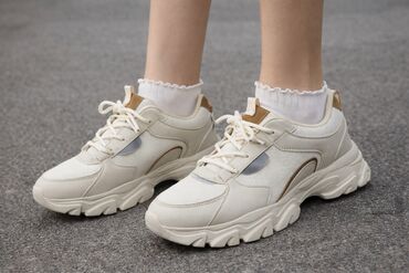 Krossovka – chunky/dad sneaker üslubu - Rəng: bej və qum tonları, qara detal vurğuları - Material: qarışıq həm parça, həm də süni dəri panellər - Bağlama: ağ-qaralı naxışlı bağlar - Daban: hündür ...