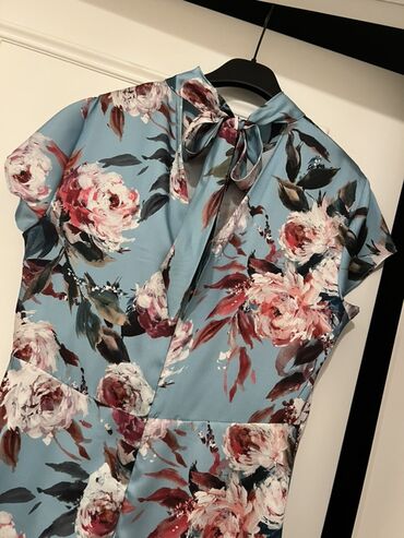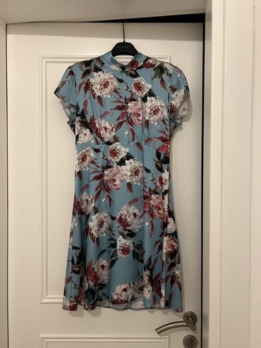 OSKAR brendli qadın paltarı - Rəng: açıq mavi (pastel blue) - Model: beldən rezinli, qurşaqlı (yanlardan bağlanan kəmər lentləri) - Yaxa: V-kəsim - Qol: qısa, yüngül büzgülü/kipləşdirilmiş kəsim -...