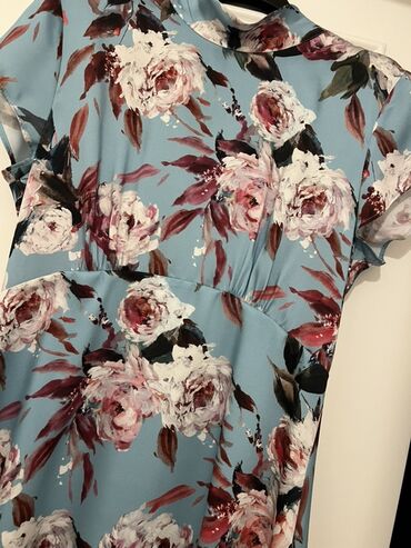 Qadın paltarı – çiçək naxışlı, uzunqollu - Rəng: tünd göy fon üzərində boz-açıq mavi çiçək printi (fərqli ölçülü çiçəklər və xırda nöqtəli motivlər) - Model: dizə yaxın uzunluqda, boş kəsimli, yün...