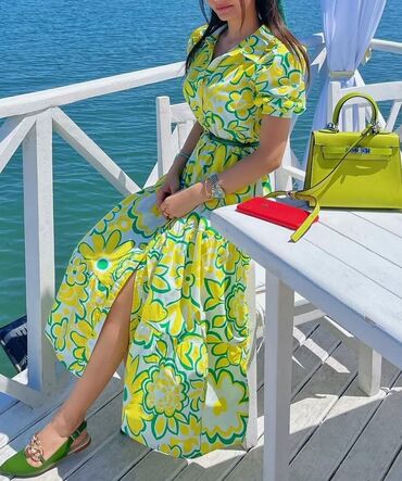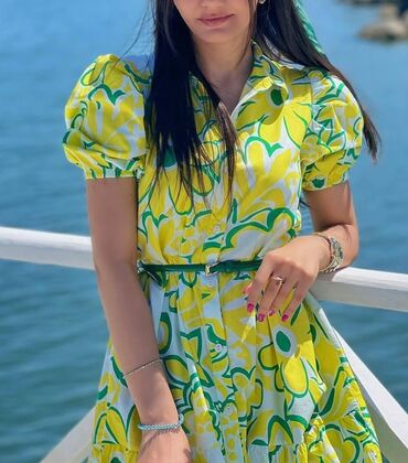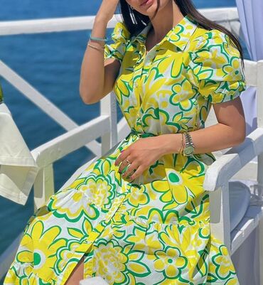 Yaylıq naxışlı qadın paltarı - Model: yüngül, dizdən aşağı uzunluqda yay paltarı - Parça: nazik, nəfəsalan, axıcı tekstura - Rəng və naxış: ağ fon üzərində sarı və qara abstrakt-bitki motivləri - ...