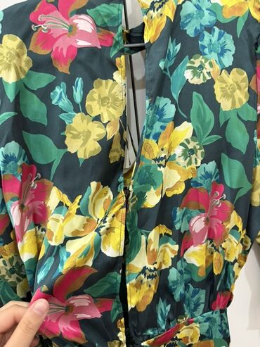 Qadın paltarı – çiçəkli dizayn - Rəng: tünd fon üzərində parlaq çəhrayı, ağ və yaşıl çiçək naxışları - Model: yuxarı hissəsi bədənə oturan, beldən pliseli, ətəyi geniş açılan (A-line/klokat) kəsim...