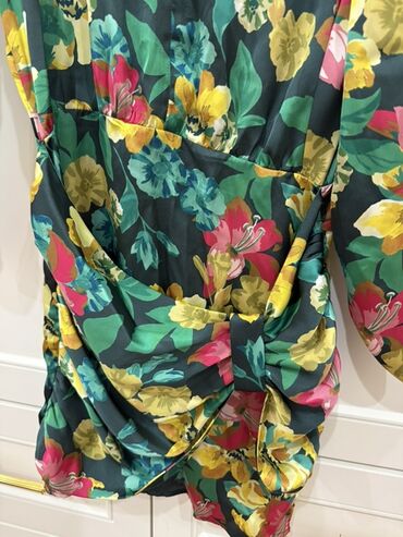 YeniTünd yaşıl rəngdə, müxtəlif rəngli çiçək naxışları ilə bəzədilmiş qadın mini donu. Bu donun uzun qolları və ön tərəfində çarpaz kəsimi var. Yaxasında V-şəkilli kəsim və ətəyində drapi detalları ilə dizayn edilmişdir. Yaz və yay mövsümləri üçün uyğundur, həm gündəlik, həm də xüsusi tədbirlər üçün istifadə edilə bilər. Dopin arxasında görünməz fermuarı var.