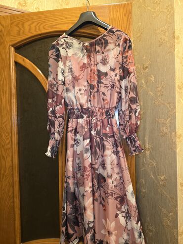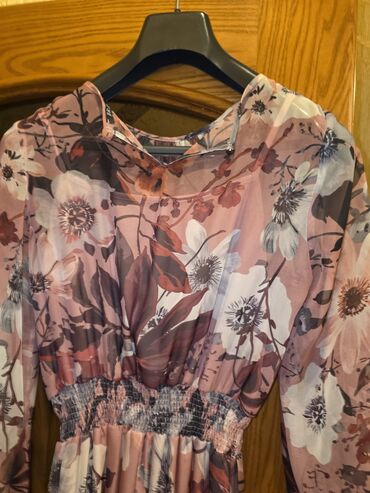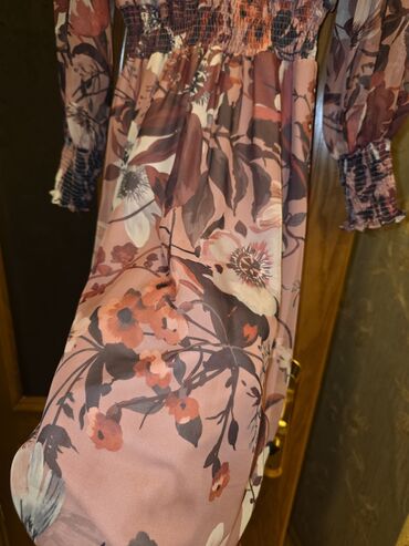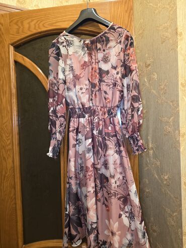 Ölçü etiketində “Esmara” qeyd olunub. Don askıda təqdim olunur, ümumi uzunluq maxi səviyyəsinə yaxındır. Çiçək printi dörd tərəfdə davamlıdır və beldəki büzgü həm ön, həm arxa hissədə mövcuddur.