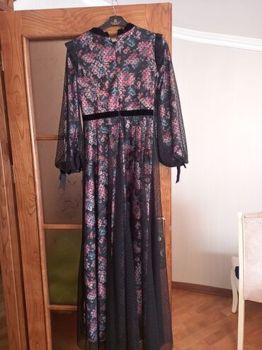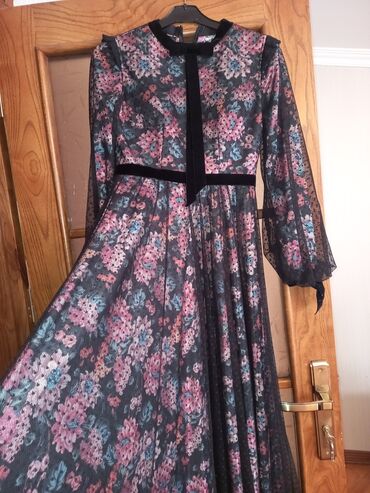 Qadın paltarı – uzun, çiçək naxışlı, şifon/tyul üst qatlı model