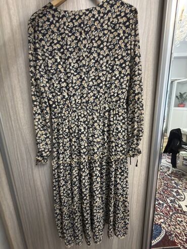 Qadın paltarı – qara fon üzərində çiçəkli naxış - Model: bohem üslubunda, sərbəst kəsim - Uzunluq: midi - Yaxa: qapalı büzgülü, bağlama ipləri ilə - Qol: 3/4 uzunluqda, rezinli uclar - Parça: yüng...