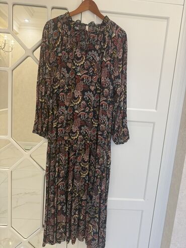 Qadın paltarı – Reliance brendi - Rəng: qara fon üzərində xırda açıq rəngli nöqtə/prınt - Model: boş kəsimli, A-siluet, alt hissədə volanlı ətək - Yaxa: geniş, yumru - Qol: uzun, yüngül şifonvari ...
