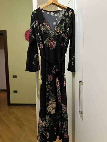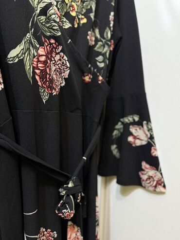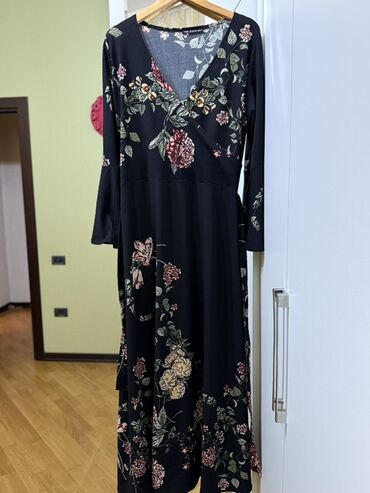 Qara rəngdə, çiçək naxışlı uzun don geyinilməyib, yenidir, razmeri kiçik olduğu üçün. - Rəng: qara əsas üzərində boz-ağ çiçək və budaq naxışları - Uzunluq: maxi/ayaqboyu - Yaxa: V formalı, iç hiss...
