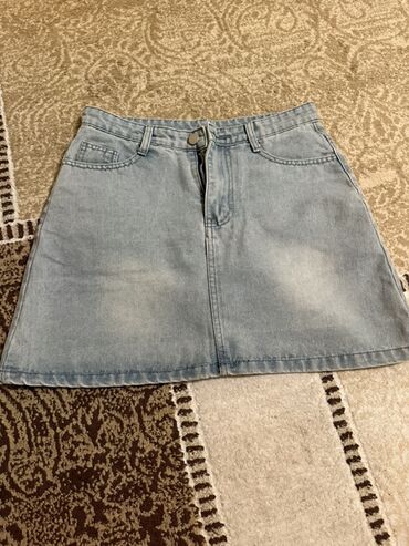 Açıq mavi rəngdə cins ətli yubka.