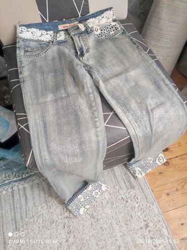 Stil: gündəlik və ya smart-casual kombinlər üçün uyğundur, bəzək detalları sayəsində fərqli görünüş yaradır. Ölçü etiketləri: jaket — S; şalvar — etiket “MISS F32”. Rəng palitrası: boz-açıq göy yuyulmuş denim, ağ krujeva və yaşıl parıltılı akssentlər.