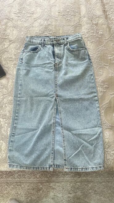 Açıq mavi rəngli denim ətək - Klassik beşcib dizaynı: iki ön cib, iki arxa cib və sikkə cibi - Yüksək bel, düymə və fermuar bağlanması - Düz kəsim, midi uzunluq - Ön hissədə dərin yarıq – rahat hə...