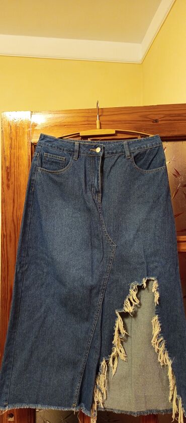 Denim ətək - Material: tünd mavi cins (jeans), yüngül solğun effektli - Kəsim: A-kəsim, dizdən aşağı uzunluq - Bel: standart bel hündürlüyü, kəmərkeçirənlər - Bağlanma: ön hissədə iki düymə və giz...