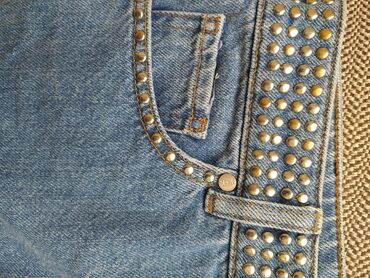 - Dizayn: bel xətti və ciblər boyunca metal stud bəzəklər; alt kənarlarda xam (saçaqlı) kəsim