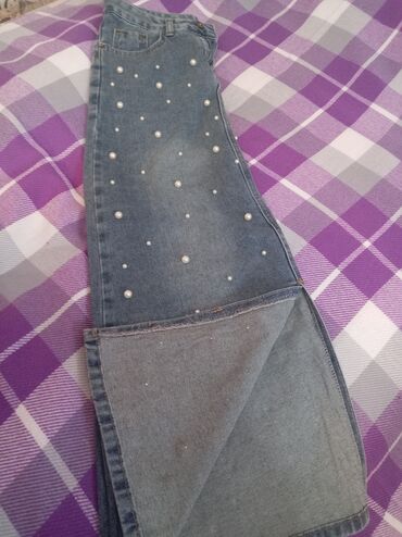 - Material: klassik mavi denim (cins parça), ön tərəfi incə və iri ölçülü dekorativ mirvari aplikasiyaları ilə bəzədilib.