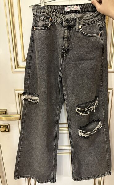Digər brendQara-boz rəngdə, yüngül ağarmalı effektli “Miele” markalı cins şalvar. Model: düz kəsim, geniş balaq (wide leg). Ön tərəfdə klassik 5 ciblə dizayn olunub: 2 ön, 1 sikkə cibi və 2 arxa cib. Beldə kəmər üçün ilgəklər, düymə və fermuar bağlanma. Hər iki diz hissəsində və bir balaqda qəsdən yırtıq/çırpıntılı detal – distressed görünüş. Parça: sıx toxunuşlu denim (pambıq əsaslı). Etiketdə ölçü 36 göstərilir. Gündəlik geyim və streetwear tərzi üçün uyğundur. Rəng və kəsim müxtəlif üst geyimlərlə asan kombinlənir.