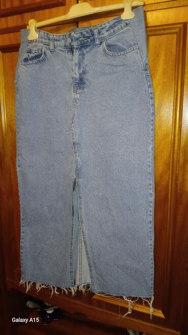 Uzun denim ətək - Material: klassik mavi cins parça - Kəsim: A-kəsim/klos siluet; ön hissədə üçbucaq panellə genişlənən dizayn - Bel: bel kəməri kölgə tikişli, kəmər üçün ilgəklər, ön düymə və fer...
