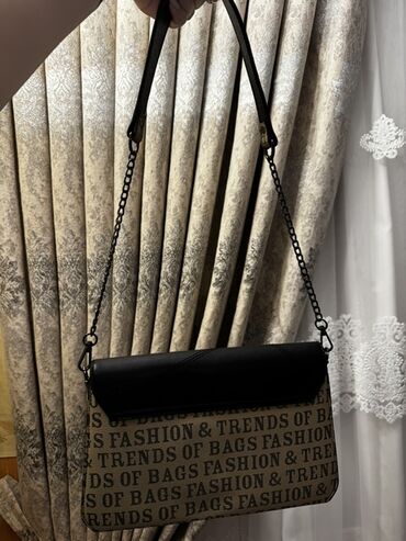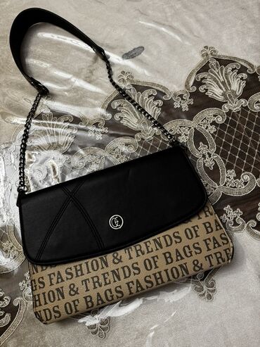 Qara və bej rənglərdə olan bu çanta dəsti, hər növ geyimə uyğun gələn dəbli və funksional aksesuardır. Dəstə qara rəngli əl çantası və bej rəngli uzun, enli çiyin qayışı daxildir. Əl çantasının qara hissəsi bərk, dəri formalı materialdan hazırlanıb və üzərində metal loqo var. Çantanın alt hissəsi bej rəngli materialdan olub, üzərində təkrar olunan "FASHION & TRENDS OF BAGS" yazıları ilə bəzədilib. Həm gündəlik istifadə, həm də xüsusi tədbirlər üçün uyğundur. 100 azn e alınıb 2/3 dəfə istifadə olunub heç bir defecti yoxdur 5 azn e satılır