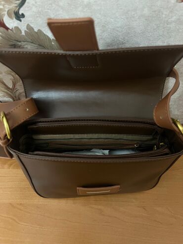 Məhsul: Qəhvəyi çiyin çantası - Material: Dəri (hamar fakturalı, möhkəm) - Rəng: Konyak/qəhvəyi - Dizayn: Üst qapaqlı (flap) model; qapağın aşağısında yarımdairəvi metal bəzək elementi - Kəmər: Tə...