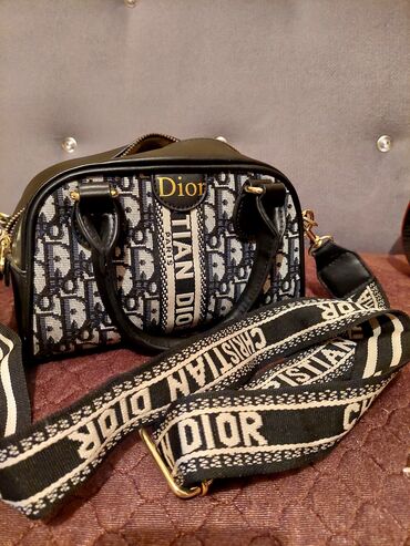 Dior stili çiyin/əl çantası - Material: parça (monoqram naxışlı) və qara eko‑dəri detalları - Rəng: tünd lacivərd/kremin kontrastı, “CHRISTIAN DIOR” yazılı mərkəz lent - Aksesuarlar: qızılı rəngli...