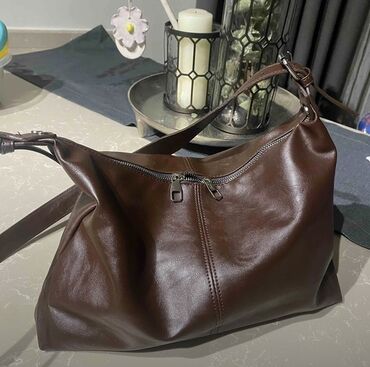Qadınlar üçün şık çiyin çantası - Model: geniş hobo/shoulder bag - Rənglər: tünd qəhvəyi və südlü qəhvə tonları - Material: yumşaq, parlaq fakturalı süni dəri - Dizayn: ön hissədə dekorativ kəmər ...