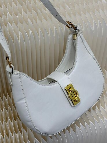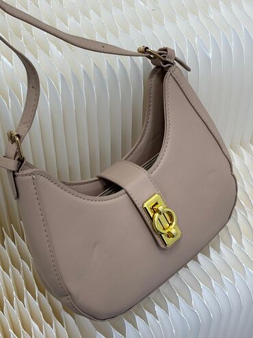 Açıq krem rəngli çiyin çantası - Material: yumşaq süni dəri görünüşlü parça - Dizayn: yığma (büzgülü) üst hissə, minimal və zərif forma - Rəng: bej/krem - Aksentlər: qızılı tonlu metal halqalar və...
