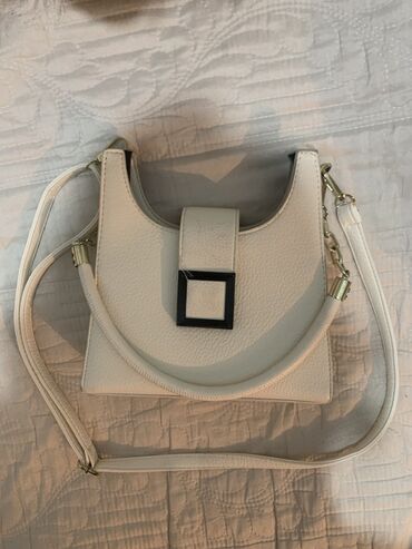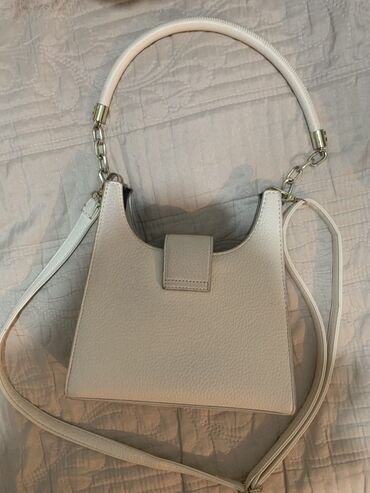 Ağ rəngli mini çiyin çantası - Material: teksturalı (qabarıq) dərili səth, qızılı rəngdə metal detallar - Forma: kompakt flap dizayn, ön qapaqda dekorativ qızılı toka - Kəmər: tənzimlənən, qoparıl...