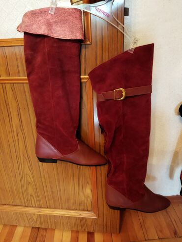 - Tünd qırmızı (bordo) uzun süet çəkmələr: düz altlıq, yan fermuar, dekorativ kəmər və qızılı tokalı model. Yuxarı hissəsi çevrilə bilən manjetlə iki cür geyinmə imkanı yaradır (klassik düz və ya qatlanmış pirat üslubunda).