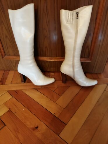 - Ağ, dizaltı hündürdaban çəkmələr: parlaq ağ dəri, yan tərəfdən gizli fermuar, sabit taxta effekti hündür daban, yumru burun. Zərif siluet, qış-payız geyimləri ilə uyğunlaşır.