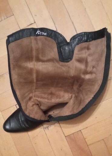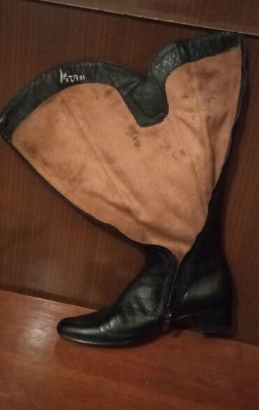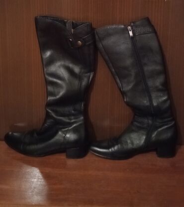 Dizə qədər uzanan qara rəngli qadın çəkmələri, hamar xarici dəri səthə malikdir. Çəkmələrin daxili hissəsi qəhvəyi rəngli, yumşaq, tüklü astarla işlənib, bu da soyuq havalarda istilik təmin edir. Yan tərəfində tam bağlana bilən fermuarı var, bu da geyinməyi və çıxarmağı asanlaşdırır. Ayaqqabının ucu dar və yuvarlaq, dabanı isə alçaq və genişdir. Bu çəkmələr gündəlik istifadə üçün rahat və praktik bir seçimdir. Onlar qış geyimləri ilə uyğunlaşa bilər.
