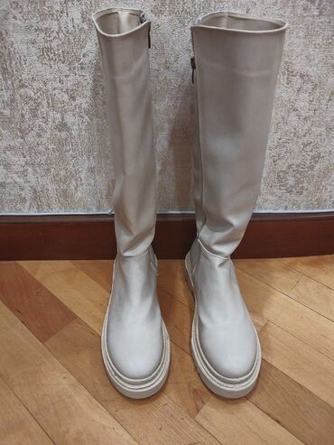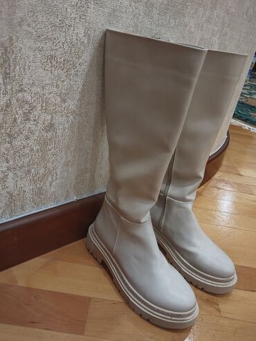 1defe geyinilib. Bej rəngli dizə qədər qadın çəkmələri