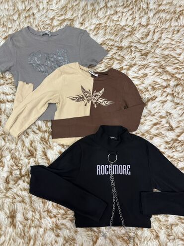 - Qara, uzunqol, yüksək yaxalı crop top. Ön hissədə “ROCKMORE” yazısı, metal halqa və dekorativ zəncir detalları. Elastik trikotaj material, bədəni vurğulayan kəsim.