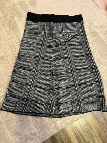 - Ətək: Dizə yaxın uzunluq, A-kəsimə yaxın rahat siluet. Qara elastik bel (kəmərsiz geyim rahatlığı üçün). Ön hissədə dekorativ qapaq və metal düymə detalı.