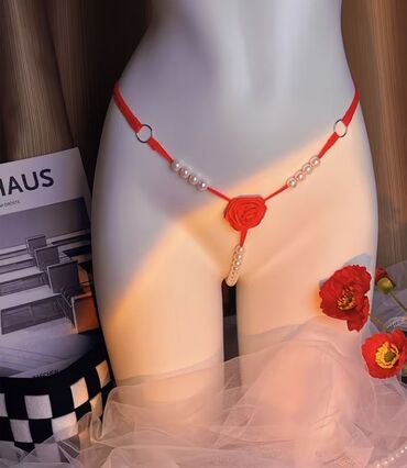 - Qırmızı incili və çiçək aplikasiyalı ultra-nazik string. Yanlarda halqa detallar, mərkəzdə qızılgül dekoru, ön hissədə incilərdən zəncir bəzəyi.