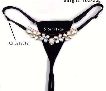 - Qara tanga: ön hissəsi 17 sm-lik bəzək xətti boyunca iri kristal daşlarla işlənmiş, tənzimlənən rezin qayışlar. Çəkisi təqribən 30 q.