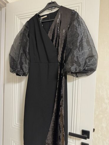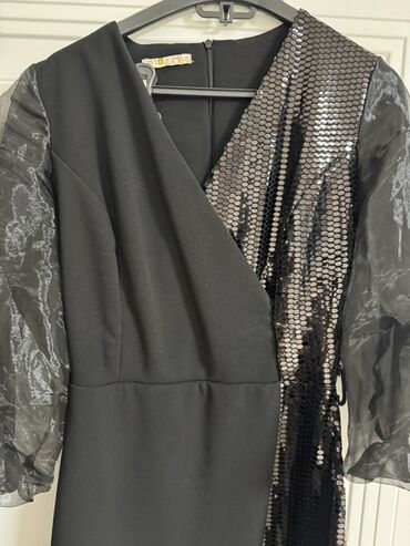 Məhsul: Qadın ziyafət geyimi - Rəng: Qara - Ölçü: XL (USA XL, MEX 42 etiketdə) - Dizayn: Asimmetrik kəsimli, bir tərəfi tam parıltılı payetli parçadan drapeli, digər tərəfi mat parça. V-yaxa, beld...
