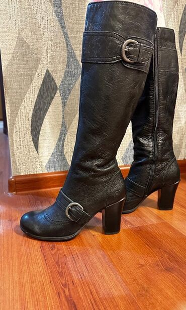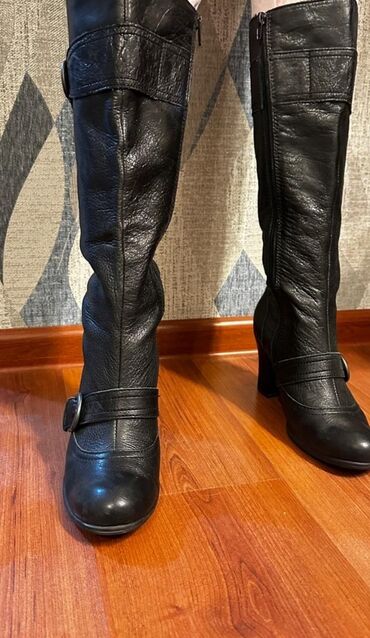 Qadın uzun temiz dəri çəkmə baha alınıb - Rəng: tünd qəhvəyi - Material: yumşaq dəridən, dekorativ iri tikişlər - Dizayn: dizə yaxın hündürlük, yan tərəfdə metal tokalı dekorativ kəmər - Daban: qa...