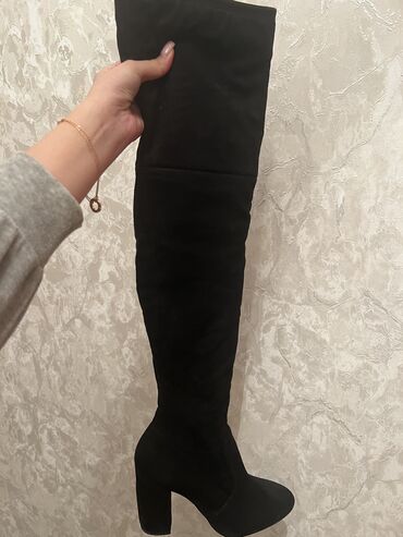 ALDO qadın çəkmələri – dizüstü, qara rəng - Model: uzun borulu, dizüstü (over-the-knee) çəkmə - Rəng: tam qara - Material: süet görünüşlü üst (yumşaq tekstura), möhkəm rezin altlıq - Daban: aşağı/...
