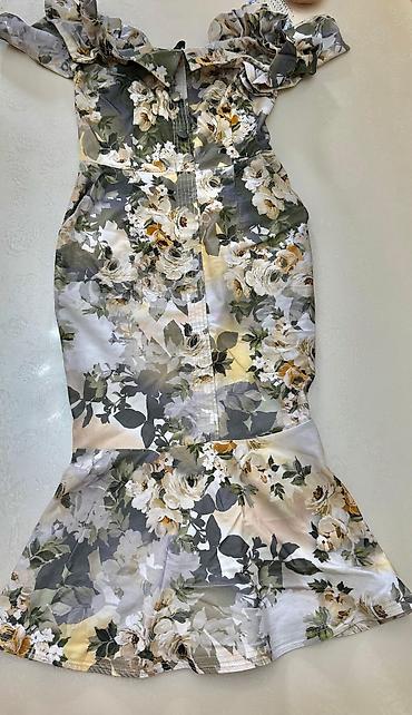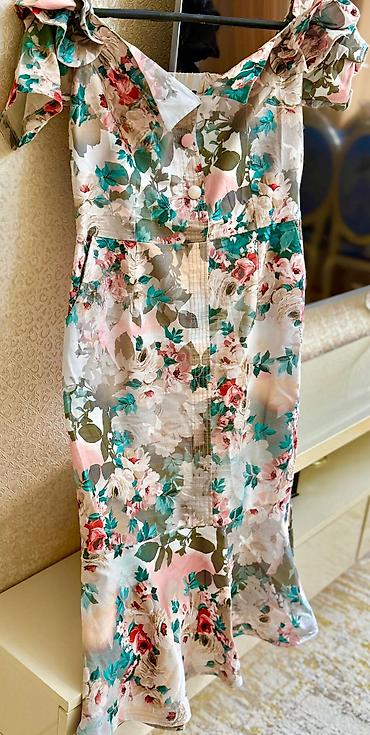 Ağ rəngli, xırda çiçək naxışlı yay donu M razmerdir razresi var yenidir - Model: midi uzunluq, nazik çiyin qayışları ilə - Yaxa: dalğalı-büzməli dekorlu, ön hissədə dekorativ düymələr - Arxa hissə...