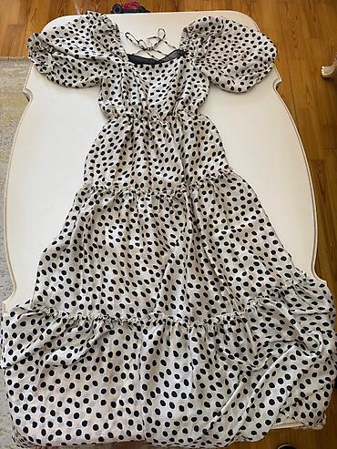 Ölçü s-m. Geyimlər 1-2 dəfə geyinilib. Səliqəlidir hər biri. Heç bir defekti yoxdur. 1) Açıq pudra rəngli, xırda nöqtəli mini/orta uzunluqlu don - Yuxa, axıcı parça - Uzun qol - Boyunda volanlı y...
