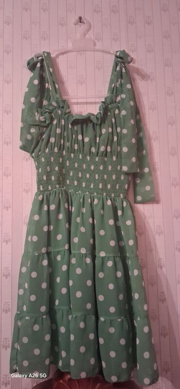 2) Yaşıl rəngli, ağ xallı gündəlik paltar 10 azn.