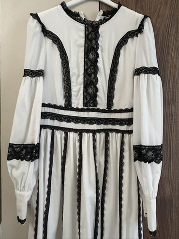 - Ağ əsas parça, üzərində qara krujeva zolaqlar və bəzəkli detallar.