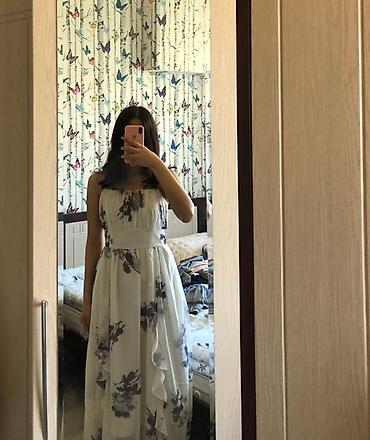 Ağ rəngli, dizə qədər uzunluqda zərif qadın donu. - Yüngül, axıcı parça; alt hissədə xırda büzgülü/plisse detalları. - 3/4 uzunluqda ətirşah qol forması. - Sinə hissəsində V formalı geniş bəz...