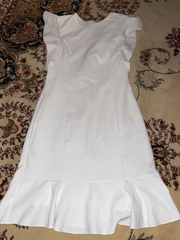 Ağ rəngli, dizə qədər dar kəsimli zərif don. Kvadrat yaxa, beldə dekorativ tokalı kəmər effekti, şifonvari 3/4 fırfırlı qol detalları. Klassik, elegant siluet – tədbir, məzuniyyət, ziyafət və ofis ...