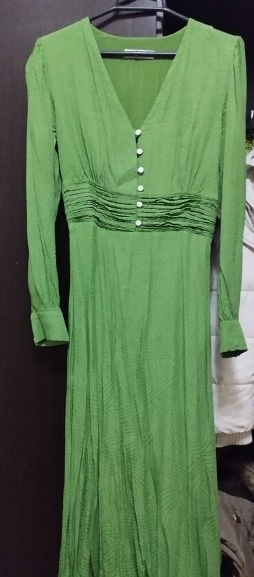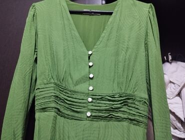 - Detallar: sinə hissəsində düymə bəzəyi (ağ/şampan rəngli kiçik düymələr), bel hissəsində eninə büzgülər və dekorativ qatlar, uzun qollar manjetli