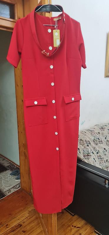 Qırmızı rəngli qadın köynək-don - Dizayn: Klassik köynək yaxası, qısa qollar, ön hissədə düymə xətti. Bel hissəsi eyni parçadan hazırlanan kəmərlə vurğulanıb; metal “C” formalı toka detallı. - Kəs...