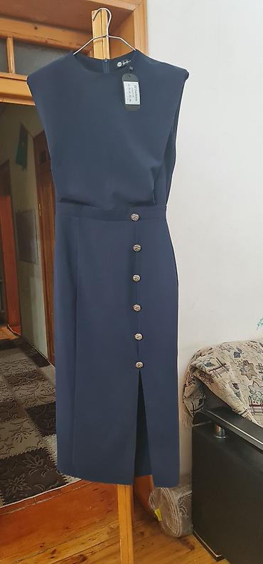 Tünd göy rəngli, klassik üslubda dizə yaxın uzunluqda qadın paltarı. Düz kəsim, qolsuz və qapalı, geniş qayıq tipli yaxa ilə. Bel xətti vurğulanıb; ön hissədə iki dekorativ/qapaqlı cib detalları gü...