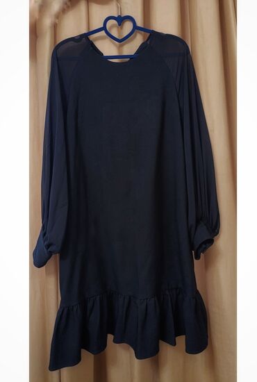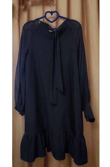 Qadın paltarı – Reliance brendi - Rəng: qara fon üzərində xırda açıq rəngli nöqtə/prınt - Model: boş kəsimli, A-siluet, alt hissədə volanlı ətək - Yaxa: geniş, yumru - Qol: uzun, yüngül şifonvari ...