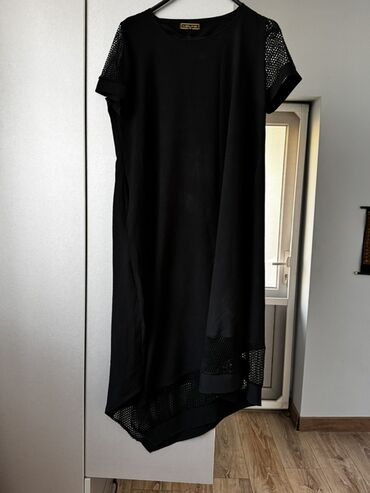 Qadın paltarı – qara rəngdə, dizə qədər uzunluqda model. - Üst hissə bədənə oturan, dəyirmi açıq yaxalı. - Ön hissədə dekorativ düymə xətti və yüngül büzgülər. - Qollar fərqli dizaynda: biri gen...