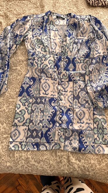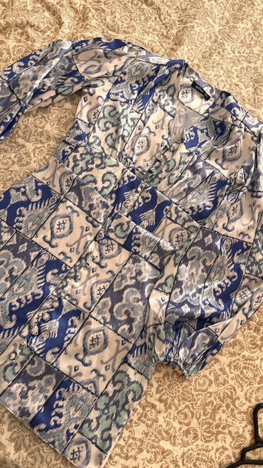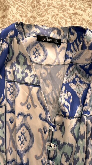 - Rəng və naxış: Göy, açıq krem və yaşıl tonlarında ikat motivli, patchwork görünüşlü print
