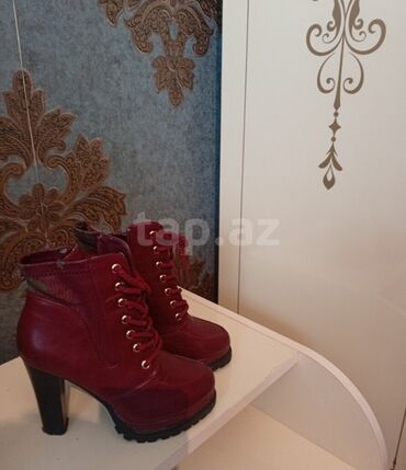 - Model 2: Bordo rəngdə, klassik şnurbağlı, dişli altlıqla sürüşməyə qarşı tutuş, hündür nazik daban və yüngül platforma.