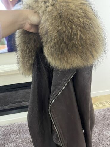 Qadınlar üçün dəri qış gödəkçəsi - Material: qəhvəyi rəngdə yumşaq təbii dəri, içlik və yaxalarda qalın süni/xəz tipli isti astar (bej rəng). - Model: beldən yığma, kalafitli uzun kəsim – buda qəd...